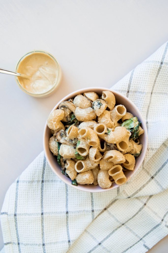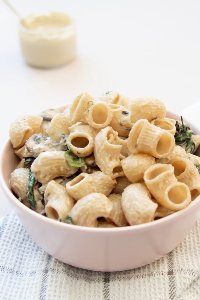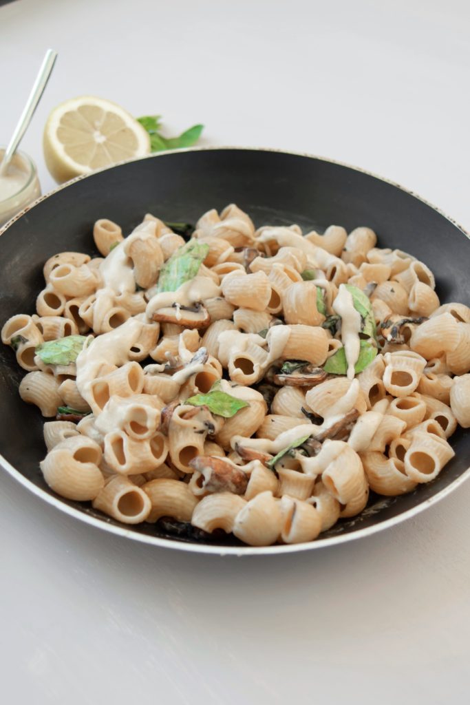 Serve with your favorite pasta or veggies. For this recipe I used quinoa “pipe rigate” shaped pasta. I also added some stir-fried mushrooms and basil.