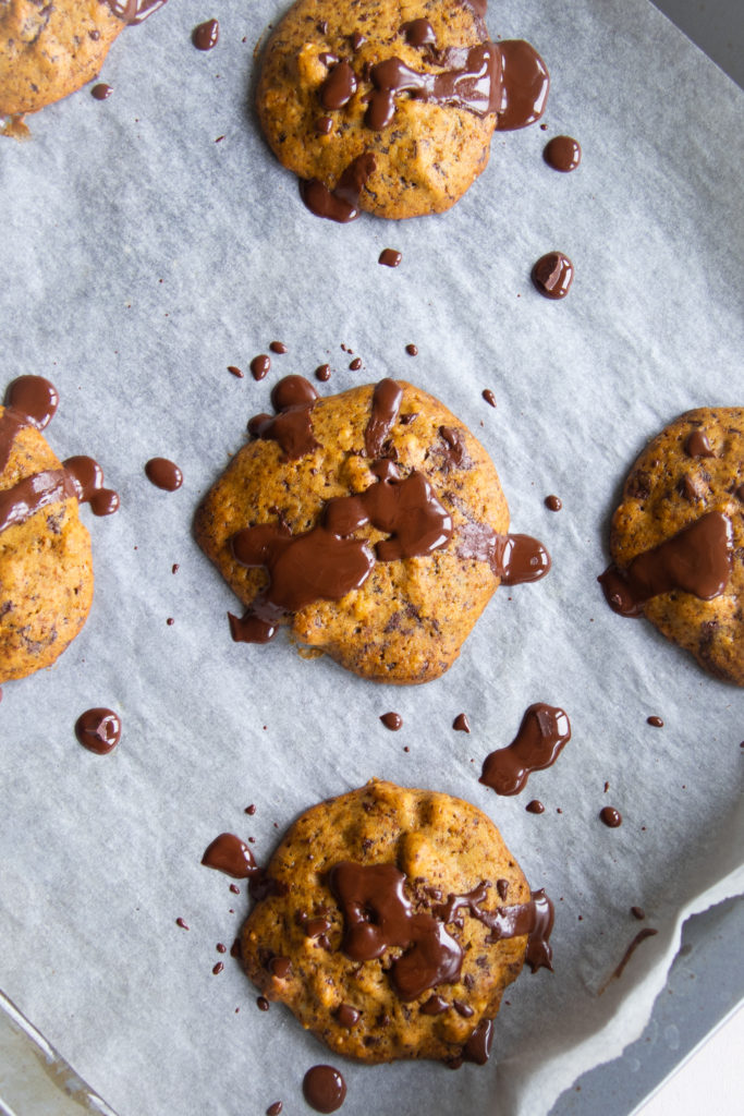 - Scoop the dough onto the prepared cookie sheet, leaving a few inches between each cookies for spreading. Bake for 15 to 17 minutes, or until the edges are golden and the centers have set. Add remaining 40g of chocolate chips on top of warm cookies.